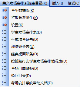 5、本系统配备两种菜单样式,用户既可以使用系统界面顶上的“荣兴考场安排系统菜单”轻松切换任何页面,也可以使用“系统界面中的小图片菜单,轻松切换页面。