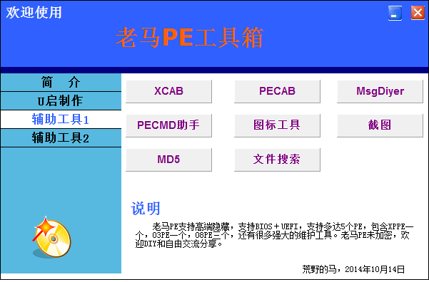 老马PE工具箱是一款绿色免费好用的PE制作辅助工具箱。软件功能强大,在它的帮助下,您不需要具备人和专业的PE知识,只需要经过简单的鼠标拖放和点击就可以轻松制作出满意的PE。您可使用它进行磁盘分区、格式化、磁盘克隆、修改密码、数据恢复、系统安装等系列日常应急维护工作。相比同性质的DOS系统维护工具,通用PE工具箱更容易操作、更容易上手。