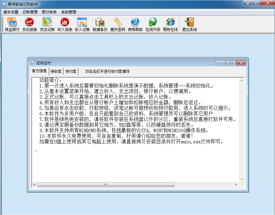 5.如果没有点击收款,付款按钮,该笔记帐可做预收和预付款用,进入系统时可以提示。