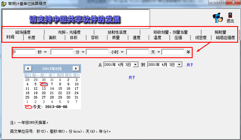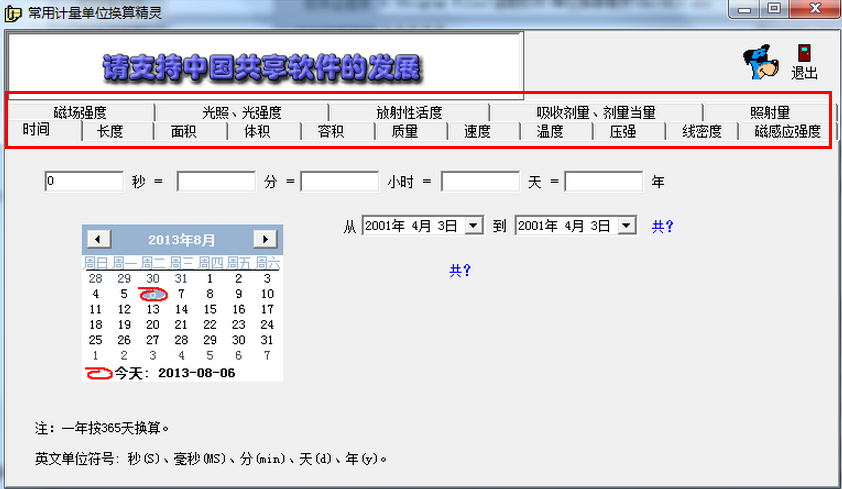 你是否知道33分等于多少秒? 2年等于多少小时?5海里等于多少米? 234平方米等于多少公顷? 5加仑等于多少升? 30克等于多少盎司? 30节等于多少千米/小时? 41摄氏度等于多少华氏度? 310帕等于多少标准大气压? ………所有这些单位换算你都无需借助计算器和手工进行艰苦的运算,只要在本软件输入你所要转换的数值,则立刻可以得出您想要的结果。本软件用VB编写。提供了时间、长度、面积、体积、容积、质量、温度、压强、线密度、磁感应强度、磁场强度、光照、光亮度、剂量当量、照射量等常用法定计量单位之间的换算。该软件为共享软件,但功能不受任何限制。