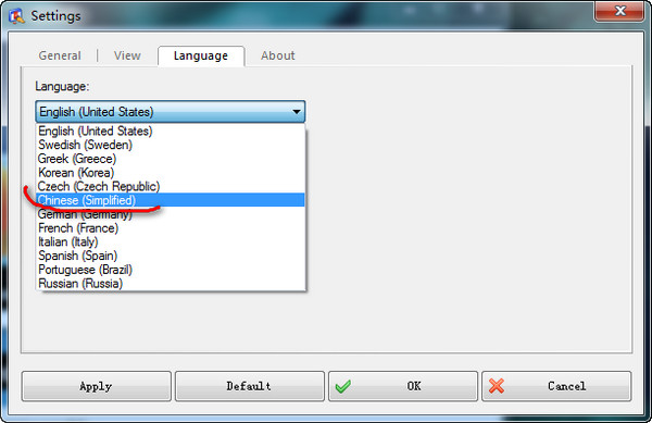 软件启动时默认为英文界面,大家可以在设置中选择语言为简体中文即可