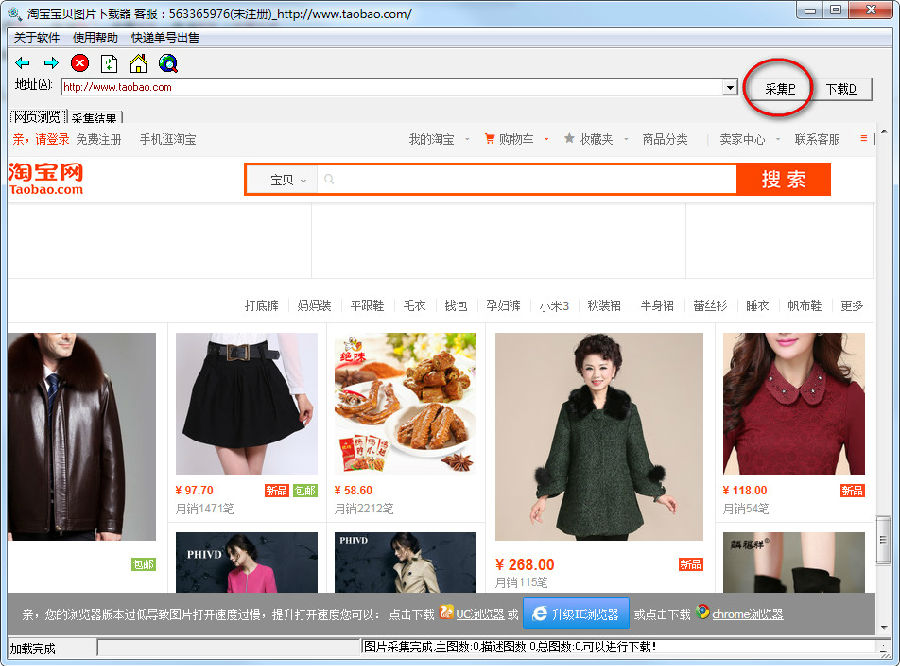 小郑淘宝宝贝图片下载器可以下载淘宝网宝贝的主图、颜色图和描述图。在地址输入宝贝的地址或利用该工具浏览到宝贝的详情页面待宝贝图片全部显示后,点击采集,采集完成后点击下载就可以把宝贝的图片下载下来了。