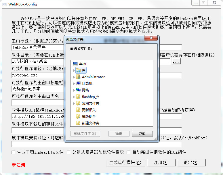 WebRBox是一款快速的可以将任意的由VC、VB、DELPHI、CB、PB、易语言等开发的Windows桌面应用软件在WEB上运行,可以快速的将CS模式应用变为BS模式应用的软件。生成的模块也可以放到任何的WEB服务器上,客户端浏览器可以动态加载WEB服务器上的WebRBox生成的软件模块到客户端网页上运行。只需要几步工作,几分钟时间就可以将CS模式应用轻松的部署变为BS模式的应用。