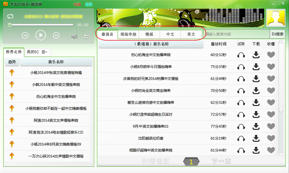 木友DJ音乐播放器,免费的DJ音乐盒,聚合了大量的DJ音乐,并按最强音、现场串烧、中文和英文,进行了分类,可在线试听,也可以下载到电脑上保存,让您尽情享受dj音乐带来的快乐。
