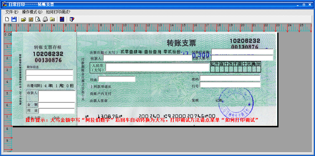 打印出来的票据准确清晰,不易涂改,对于防范风险、确保安全、规范管理起到很好的作用。可根据用户需要自行设置各种各样格式的打印票据,既可全完打印也可套打;支持各种型号的打印机,是真正意义上的万能票据打印软件。