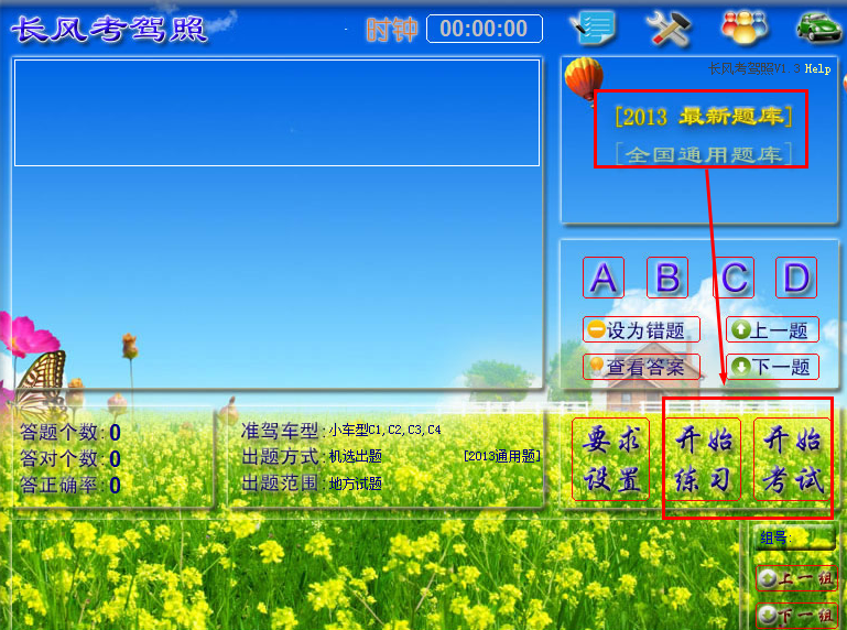 第二步:打开软件界面后,选择题库的形式,然后再选择开始练习,或者开始考试的按钮。就可以了。