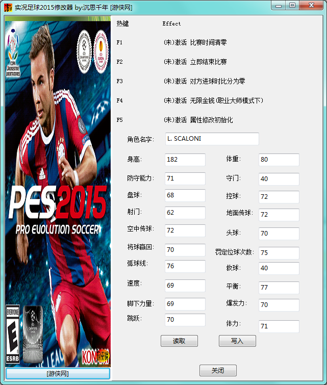 实况足球2015五项修改器是一款用于《实况足球2015》的修改工具,主要为安装后可对游戏的5项属性进行修改,包含了比赛时间清零,立即结束比赛,对方进球时比分为零,无限金钱、人物属性修改。欢迎有需要的玩家前来下载使用。