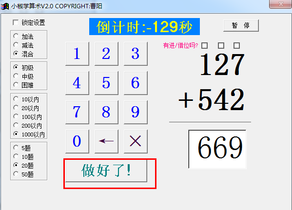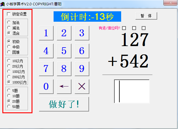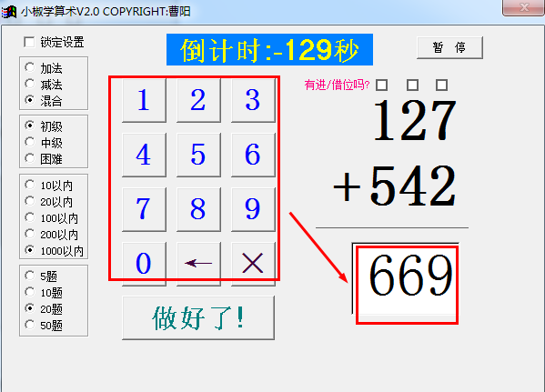 2、可用鼠标也可用键盘输入数字,在不同的难度级别时数字输入顺序不同,如在困难级别或20以内的初级级别数字是从左到右输入的,其它模式数字是从右到左输入的(符合竖式计算先算个位再算十位的习惯)。