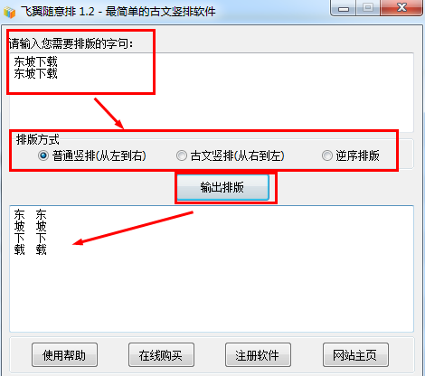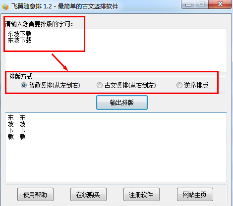 飞翼随意排可以将普通的横排文字段落自动排成竖排样式。它支持“普通竖排(从左到右)”、“古文竖排(从右到左)”、“逆序排版”三种排版方式,可广泛用于古籍排版、论坛签名、个性说明等众多场合。