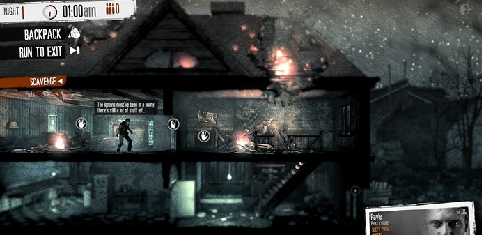 这是我的战争包含了FPS的玩法,不过更多的是惊悚的生存游戏色彩更加浓烈,而玩家需要根据个人的道德准则做出艰难的决策。“战争中,并非人人都想赴前线杀敌”,这是游戏中一句极具讽刺的口号。制作方也是希望通过这一部作品向世人展示战争的另一面:国破家亡,流离失所