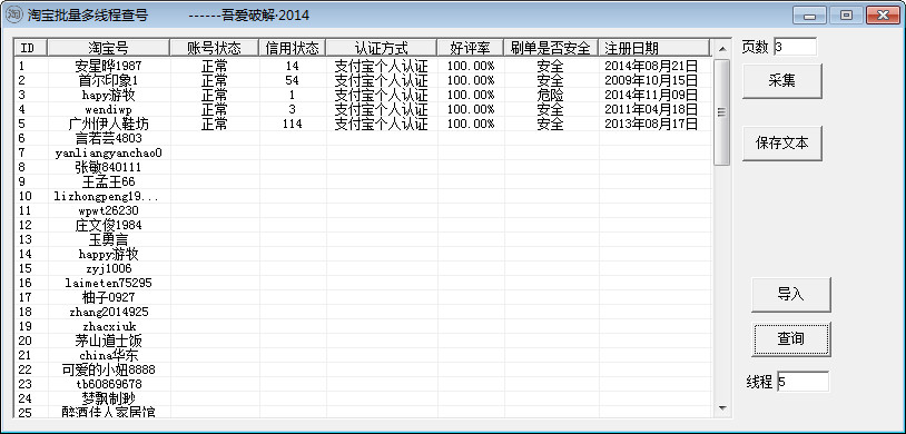 淘宝批量多线程查号(淘宝批量查询小号)是吾爱网友制作的一款批量查询淘宝小号状态的工具的。有了它以后逛淘宝就更放心了。