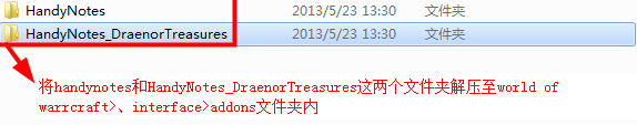 1、将handynotes和HandyNotes_DraenorTreasures这两个文件夹解压至world of warrcraft>、interface>addons文件夹内