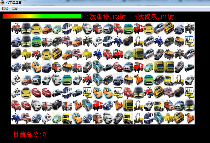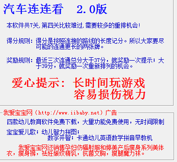 连连看系列游戏相比很多玩家朋友们都玩过吧。那么有很多喜欢汽车的朋友们一定会喜欢玩关于汽车主题的连连看吧。汽车连连看2.0版,本软件共有7关,第四关比较难过,需要较多的重排机会。好了,废话不多说了,接下来,开始介绍吧。