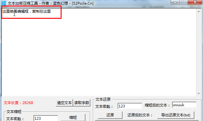 4、还原在右下角,输入密匙(如果生成的时候没填这里也不填),和缩短后的文本,点击还原即可