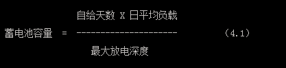 II. 第二步,将第一步得到的蓄电池容量除以蓄电池的允许最大放电深度。因为不能让蓄电池在自给天数中完全放电,所以需要除以最大放电深度,得到所需要的蓄电池容量。最大放电深度的选择需要参考光伏系统中选择使用的蓄电池的性能参数,可以从蓄电池供应商得到详细的有关该蓄电池最大放电深度的资料。通常情况下,如果使用的是深循环型蓄电池,推荐使用80%放电深度(DOD);如果使用的是浅循环蓄电池,推荐选用使用50%DOD。设计蓄电池容量的基本公式见下: