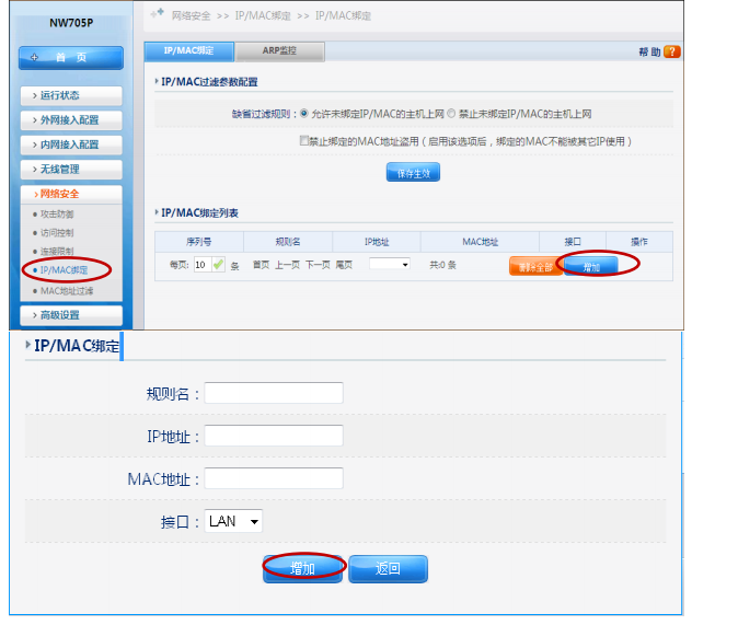 1) 点击“增加”按钮,然后手动在下面的对话框中输入要绑定的IP 和MAC地址规则