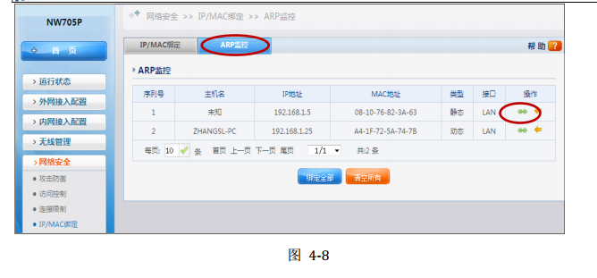 2) 选择ARP监控中的自动绑定,选择绑定后,绑定的数据将出现在IP/MAC 绑定列表中,如下图 4‐8所示: