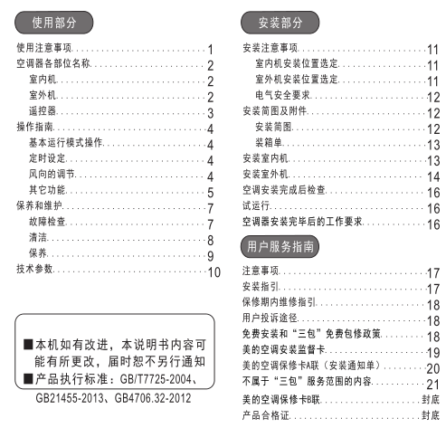 美的悦驰系列使用安装说明书目录