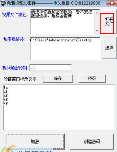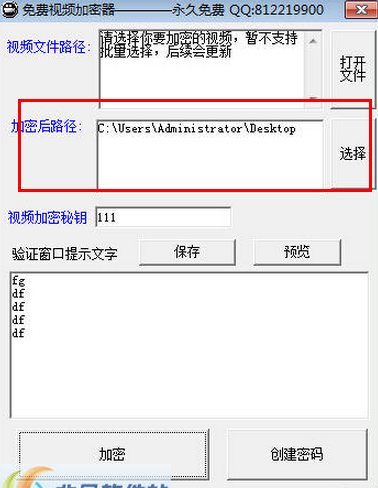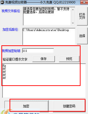 第三:填写视频加密秘钥和验证窗口提示文字。最后点击加密或者是创建密码。