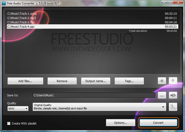 Free Audio Converter 是一个免费的音频格式转换器,支持aac, ac3, aiff, ape, flac, m4a, m4b, mka, mp3, ogg, ra, tta, wav, wma等常见音频格式直接的转换。