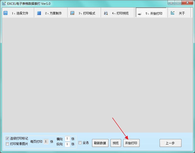5)正式打印时,提供是否连续打印、是否打印背景图片(套打)、按第二步方案选择的纸张类型每页打印布局页面的张数,并提供预览等功能。