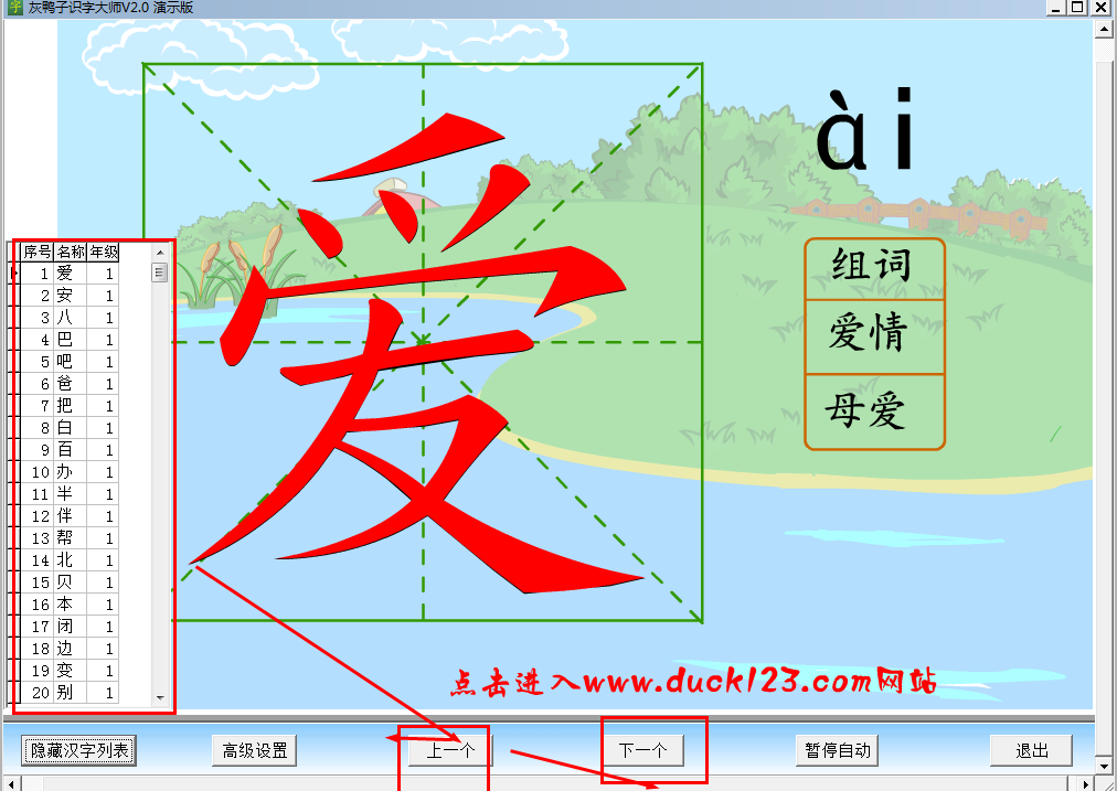 大家有没有听说过灰鸭子识字软件呢?这个灰鸭子识字软件是一款操作简单,内容丰富的专业级的多媒体识字软件。涵盖了小学课本全部汉字的笔顺动画,并且伴有字和组词的读音。接下来,介绍一下。