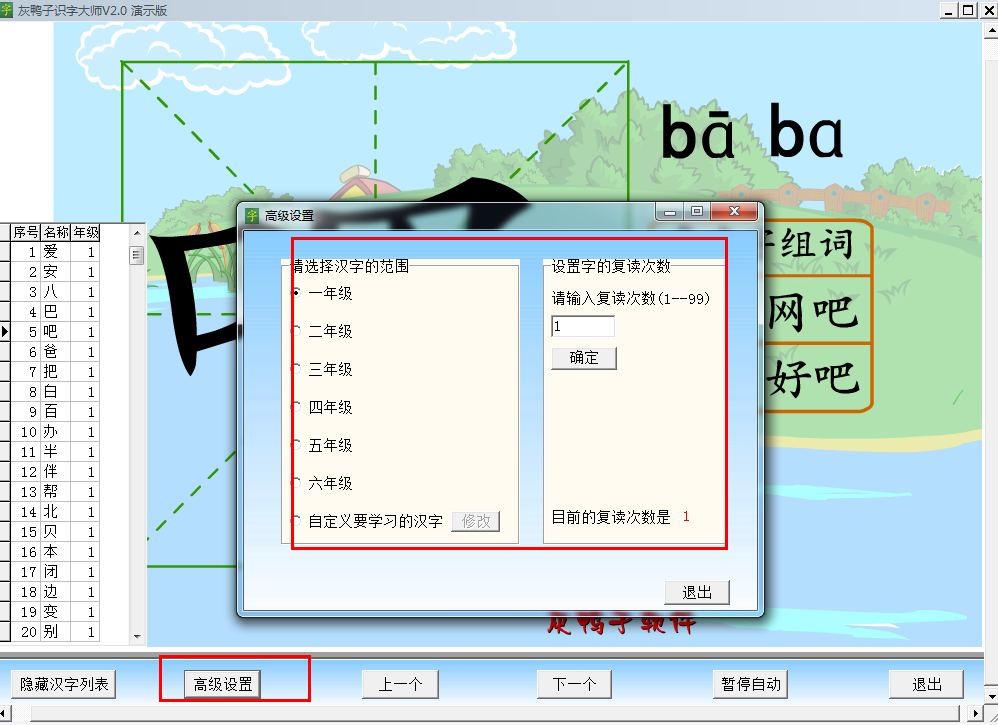汉字按照人教版教学大纲分成1--6个等级,分别对应1--6年级的小学生,学龄前的孩子可以学习一年级的所有汉字。软件可以自定义要学习的汉字,可以设置每个汉字复读的次数,软件自动顺序循环播放。使用本软件可以大大地提高孩子的识字速度和书写能力,是所有需要学习汉字人士的好帮手。本软件为共享软件,您可以下载使用演示版,正式版暂不提供免费下载使用, 演示版有内容限制,只可以学习每个年级的前六个汉字。