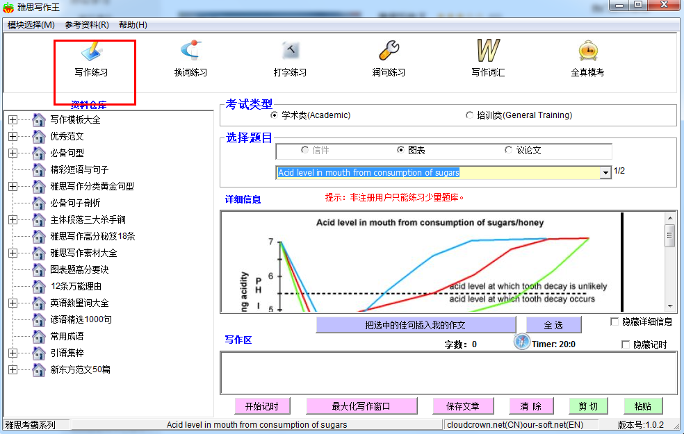 目前市场上唯一一款专门用于突破雅思写作的优秀软件。共分六个强大模块:写作练习、换词练习、打字练习、润句练习、写作词汇及全真模考。 写作练习模块 60篇精典写作模板,囊括学术类、培训类作文Task 1及Task 2的各种题型、各种应对方式。537篇精彩范文,史上最全,雅思写作的全面示范。