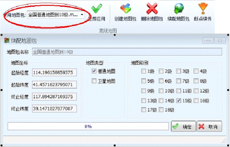 1)创建离线地图包:首先要先选择需要离线地图的范围,然后点击工具栏上创建地图包按钮,弹出窗口:输入地图包名称,选择地图类型和地图级别(地图级别指地图缩放的比例)后,点击确定按钮,窗体上的进度条会显示下载进度。
