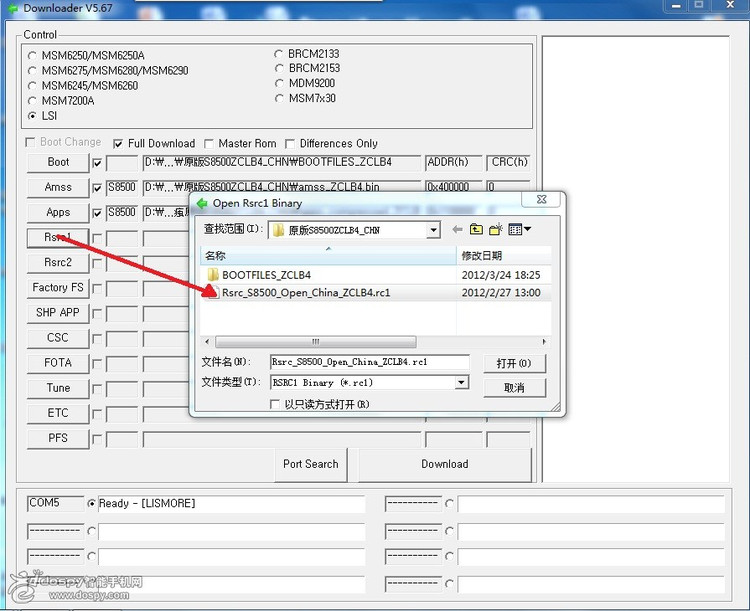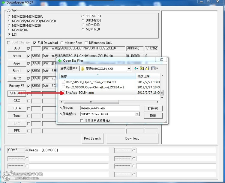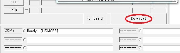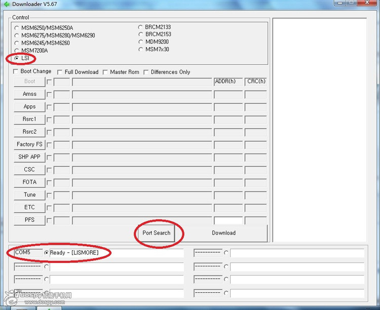 3、电脑上关了Downloader V5.76窗口,再重新运行MultiLoader V5.67.exe,点击【port search】按钮如下图,“com5”会自动出来,不出就 不正常了