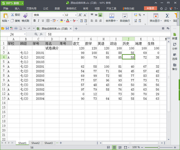 *录入成绩:运行软件后,参照界面中图片说明将原始成绩表适当调整,要求原始成绩保存在Sheet1表中,第一行第一格开始依次为“班级”“学号”“姓名”“考号”,考号后面紧跟考试科目名称,可随意添加科目。其中“班级”“考号”项为必填项(为空的话将不计入应考人数),考号、学号必须为数字格式。班级要么全为数字格式,要么全为文本格式,姓名也是如此。