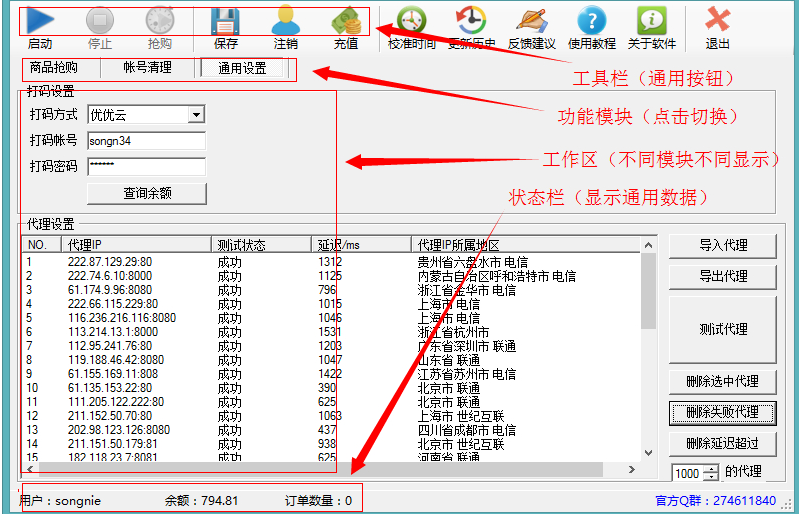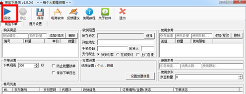 工具栏: 通用按钮的集合,控制着所有模块,对所有模块都有效,如:“启动”对应“商品抢购”模块时表示启动抢购操作,对应“订单查询”模块时表示启动查询操作。