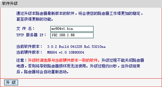 3,如果遇到“升级不成功,传送的文件版本号有误,请检查文件名是否正确。”的错误提示,请确保您下载的升级文件是对应您路由器型号和硬件版本的。注意除了产品型号外,不同硬件版本也有不同的升级程序,您的产品硬件版本可以在升级页面中查看得到。
