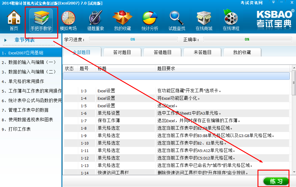 第一步:打开软件,点击“手把手教学”按钮,再点击“练习”