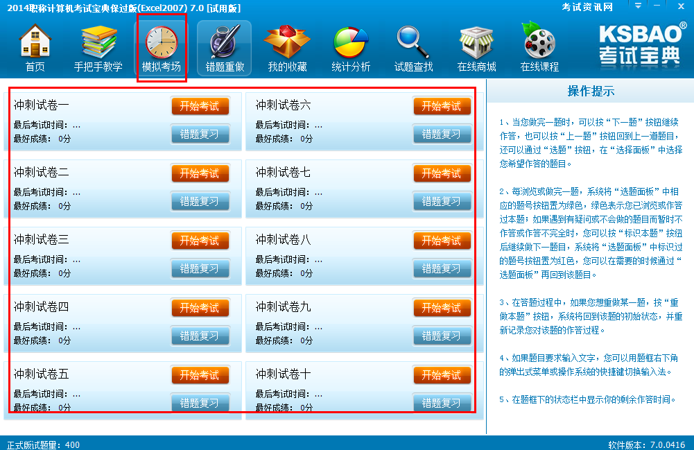 软件结合了称计算机考试的特点,将实际操作知识与基础理论知识完美结合,同时通过手把手教学、模拟考场模块,让考生能够对操作与理论有效联想,对考点也更有立体感知。英腾软件作为行业的领跑者,与多个国家级资格考试权威机构保有密切的合作关系,保证选题具有权威性!