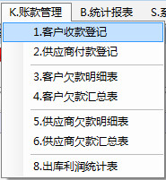 9、往来账款模块 包括功能:已收款登记、已付款登记、应收款明细表、应收款汇总表、应付款明细表、应付款汇总表、利润统计表