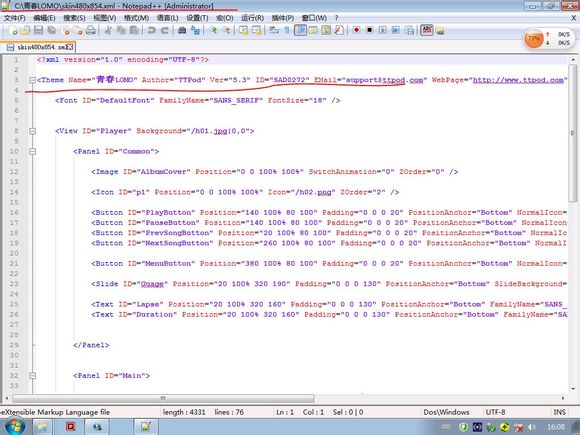 皮肤里面还有那些.xml文件,你可以用Notepad++打开进行编辑,比如修改皮肤名称,调整按钮图片坐标