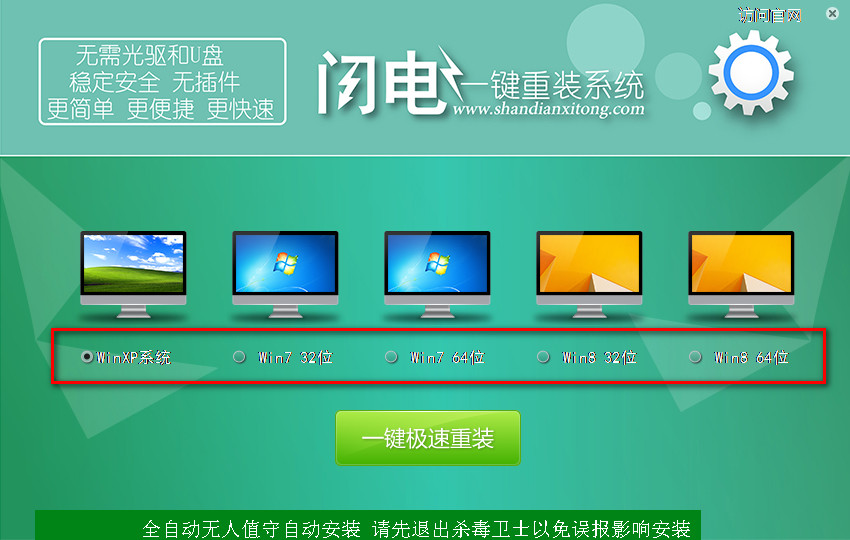 闪电一键重装系统是款支持一键重装xp/win7/win8系统的软件,采用高速下载内核,实现了系统的快速下载,完美的ghost技术,功能强大操作简单,是款不错的重装系统软件。
