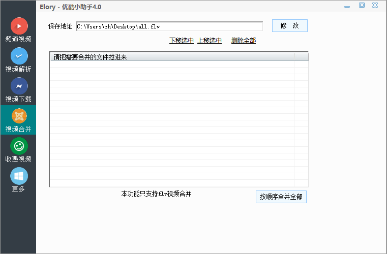 4、视频合并:设置保存地址,选择需要合并的flv视频,点击【按顺序合并全部】即可