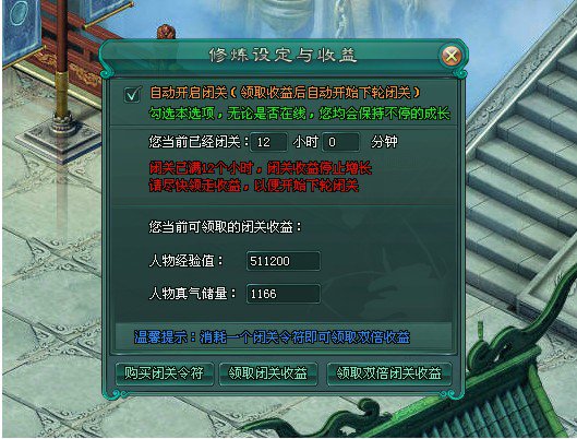人物离线后还会获得经验和真气,最高可累积12小时,就算退出游戏也能有所收获哦~