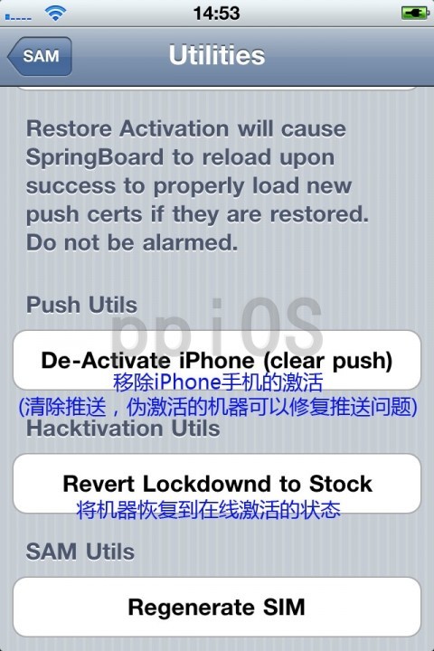 5、点击【De-Activate iPhone (clear push)】以及【Revert Lockdownd to Stock】
