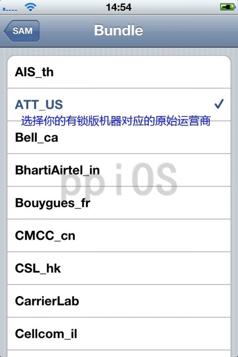 8、点击 【Bundle ID】,选择你的 iPhone 的原产国,比如美版就选 ATT_US,选好后返回主界面