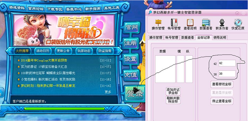 第四步:将鼠标移动到梦幻西游客户端的进入游戏的按钮上,像第三步一样将横坐标和纵坐标手动输入到编辑框中,按添加并记录按钮