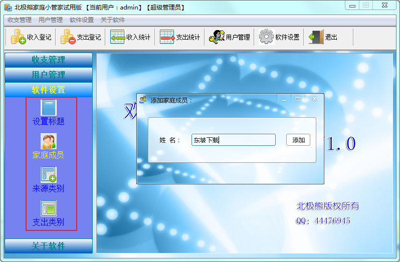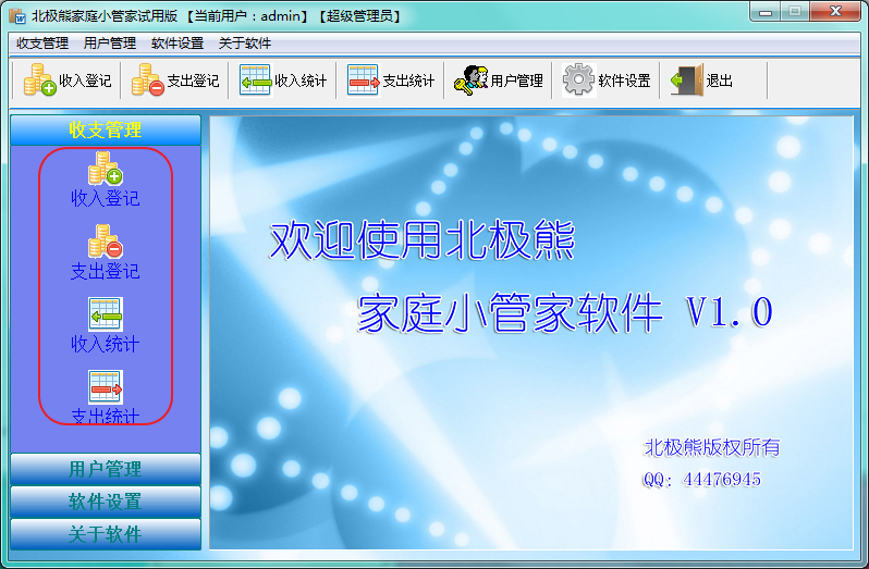 北极熊家庭小管家支持收入登记、支出登记、收入统计、支出统计、数据导出到Excel、打印等功能。还支持分类用户收支统计,再大的家庭也不用担心。绝对是目前市面上家庭理财软件的标杆,最重要的是软件还是免费的!