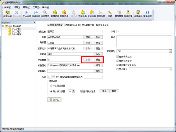 场景参数“中奖数量”输入框右侧的“字体”和“颜色”按钮用来调整号码的字体和颜色,如下图所示: