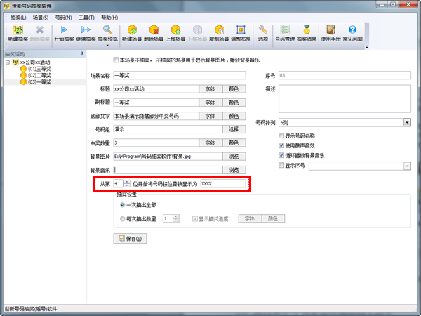 为了保护隐私,电视台进行手机号码抽奖时经常隐藏手机号码中的几位号码,如“139XXXX8878”,世新号码抽奖软件提供屏蔽部分中奖号码的功能,不仅可以使用“X”替换号码,还可以使用汉字等字符替换号码,如“139奖奖奖奖8878”,在场景参数中设置屏蔽起始位置以及替换字符串,如下图所示: