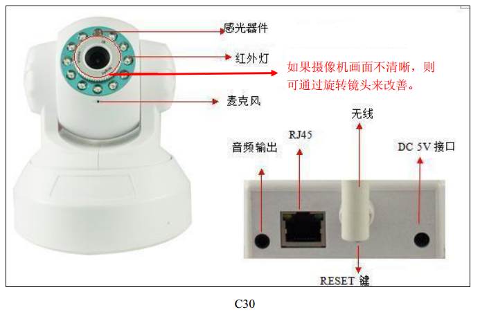 1个10/100M以太网RJ45口 内置WI-FI 1个电源接口 1个复位按钮 内置麦克风 1个3.5mm音频输出接孔 11颗红外灯,8米有效 接口