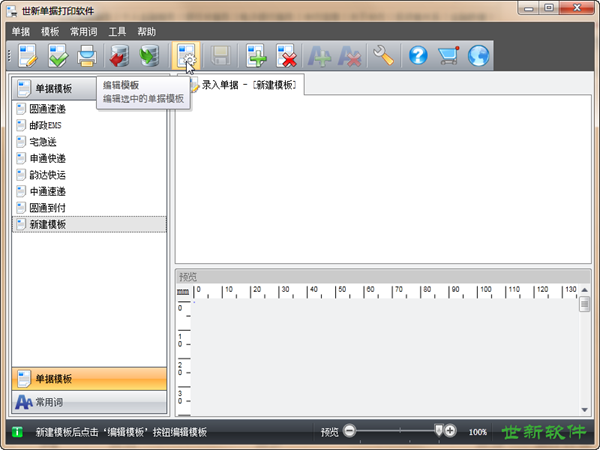 1、运行世新单据打印软件,点击“新建模板”按钮新建一个模板,然后在单据模板列表中单击新建的模板,如下图所示: