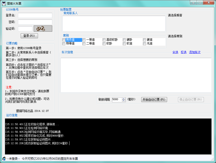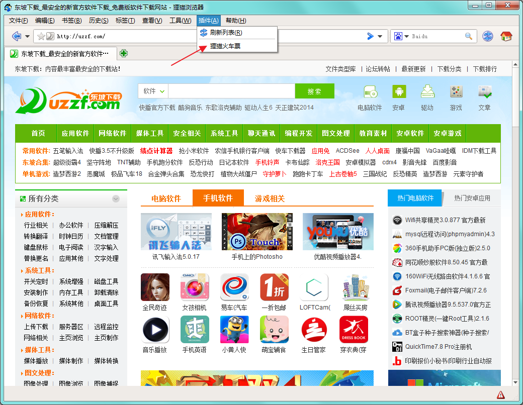 进入浏览器主界面,点击菜单栏中的“插件”->"狸猫火车票",即可打开抢票功能插件。