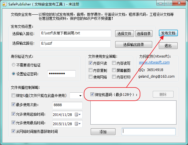 3、可选或不选绑定机器码,点击【发布文档】